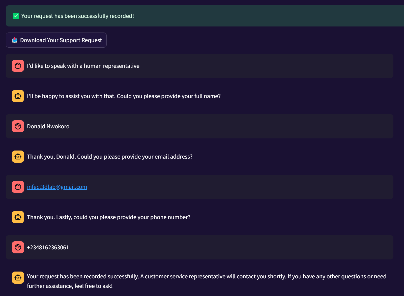 Connect with a human representative when you need personalized support, you can download your support request for reference.